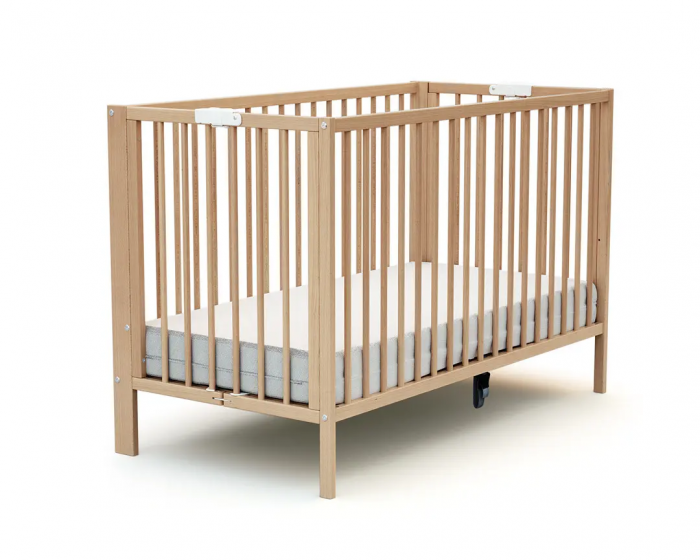 Designed for convenience, it folds quickly and securely while keeping the slatted base integrated within the structure. Two safety locking handles ensure stability when folded or opened, while the two-position adjustable base provides ergonomic comfort for both baby and caregiver.