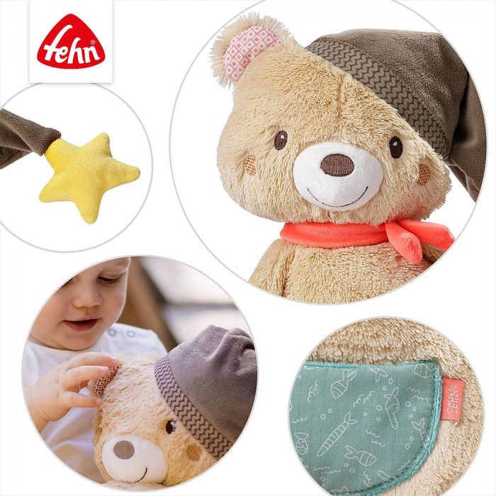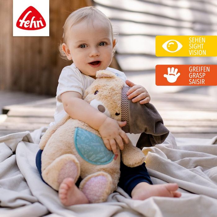 At a generous size of 42 cm, Bruno offers an exceptional playing, cuddling, and nurturing experience, bringing immense joy and comfort to your little one. Wrapped in an aura of cuddles and warmth, this Fehn stuffed toy emerges as the quintessential first friend, ready to embark on countless adventures with your baby.