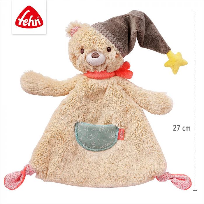 During the day, the ultra-soft materials, the bear’s sleepy hat and the small tummy pouch encourage babies to grasp, feel and explore. These simple sensory moments help develop early motor skills and keep little hands busy. Whether at home or on the go, this cuddly comforter provides security, affection and endless snuggles. Made from plush, velour and printed fabric with a soft polyester filling, it is independently safety-tested. The comforter is machine washable at 30°C and should be left to air dry fully.
